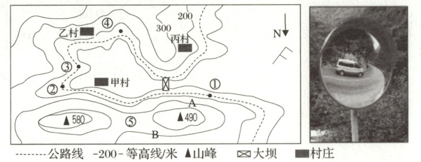 凸面镜又叫广角镜,可用于各种弯道、路口,扩大司机视野,及早发现弯道对面车辆。其成正立、缩小的虚像,成像方向与现实中的方向左右相反,上下一致。下图为某地等高线图和凸面镜成像图。