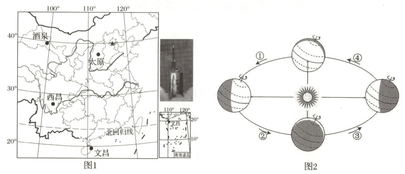 神舟出征,再问苍穹。北京时间2025年4月24日17时17分,神舟二十号载人飞船在酒泉发射成功;神舟二十号载人飞船计划于2025年10月下旬择机返回内蒙古着陆场。图1为我国四大航天发射场位置示意图,图2为地球公转示意图。读下图,完成10~12题。