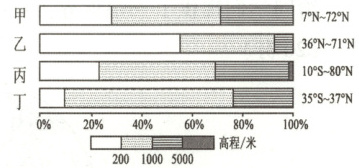 2. 右图中甲、乙、丙、丁分别表示四个大洲不同海拔的面积比例和纬度范围,下列说法正确的是(