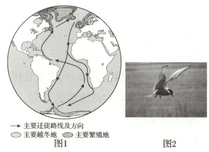北极燕鸥是一种海鸟。北半球夏季,它们在北极地区繁殖,北半球冬季,因食物短缺和迁徙本能飞往南极附近越冬。每年在两极之间往返一次,行程有数万千米,被称为动物界的“迁徙之王”。图1为北极燕鸥迁徙路线图,图2为北极燕鸥图片。读图,完成11~13题。