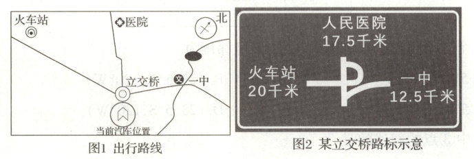 13. 地图是日常生活中必不可少的工具。2024年5月1日,家住宜城的小明同学乘汽车去火车站,出行路线如图1所示,小明到达立交桥时看见一个路标,如图2所示。下列小明对路标的判断,错误的是(