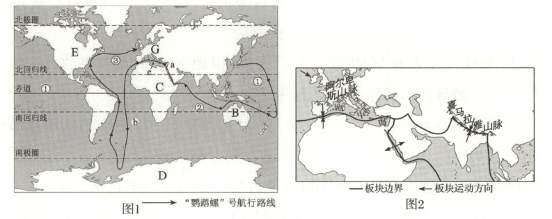 28. 《海底两万里》是法国小说家儒勒·凡尔纳的代表作之一,他带领读者登上“鹦鹉螺”号,随着尼摩船长和他的“客人们”饱览变幻无穷的海底世界。结合“鹦鹉螺”号航行路线图(图1)和局部板块示意图(图2),回答下列各题。(13分)