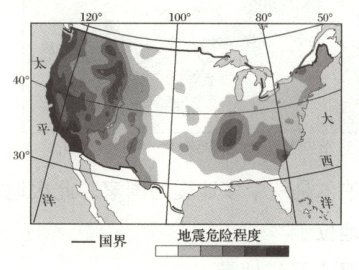 【区域认知】下图示意美国本土地震危险程度的分布,颜色越深代表地壳运动越活跃,危险程度越高。读图,完成第 13 题。