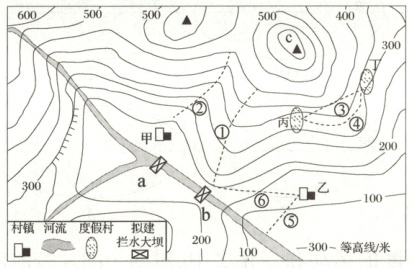 ,乙村欲从河流中引水,⑤⑥两条引水路线中,⑥