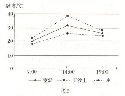 【地理实验】为探究影响气候的因素,某校地理小组进行了实验。如图1所示,实验准备了干沙土、水、温度计,同时置放于教室,学生分别于7:00、14:00和19:00测量记录温度。图2为实验数据图。读图,完成11~12题。