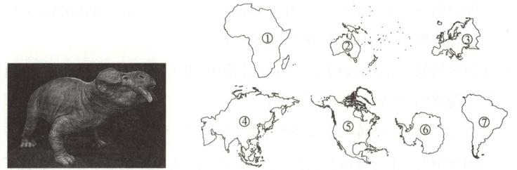 肯氏兽是三叠纪时期中国北方陆生四足动物的代表,它的化石在亚洲、非洲、南美洲、北美洲等地都有发现。肯氏兽原本生活于同样的环境中,现在它们的化石却远隔重洋。下图为肯氏兽图片和七大洲轮廓图。读图,完成23~24题。