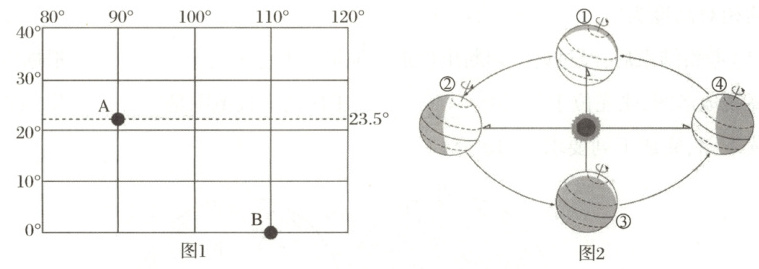 (3)当太阳直射A点时,地球位于图2上的