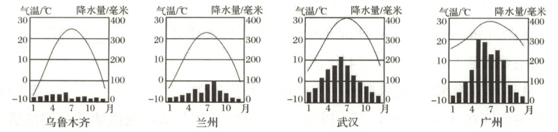 读乌鲁木齐、兰州、武汉、广州的气候资料图,完成7~8题。
