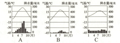 材料三 下图分别为A、B、C三地的气候资料示意图。