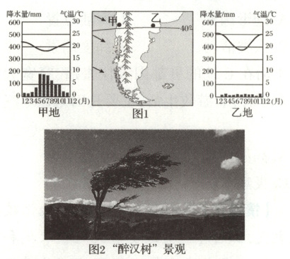 【情境化】某科考队在考察南美洲南部气候和植被情况时,发现甲、乙两地降水差异明显。南美洲南端的火地岛有很多树木的树冠形状奇特,当地称作“醉汉树”。图1示意甲、乙两地气候资料图,图2示意“醉汉树”景观。据此完成9~11题。