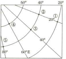 A. 图中五个点位于低纬度的是①,位于高纬度的是④