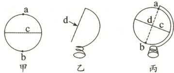 。第3步:在乒乓球a、b两处各钻一个小孔,将铁丝d从乒乓球小孔中穿过,然后用胶布裹几圈。这样可以将乒乓球固定在铁丝d的中间,同时乒乓球又可以转动。(如图丙所示)