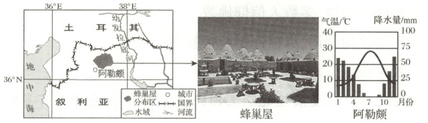 蜂巢屋是叙利亚阿勒颇地区的传统民居,具有圆锥形屋顶,除石质基底外,全用土坯堆砌而成,墙体厚达80厘米。房屋除一道拱形大门外,没有一扇窗户。下图依次为叙利亚区域图、蜂巢屋景观图、阿勒颇气候资料图。读图,完成7~8题。