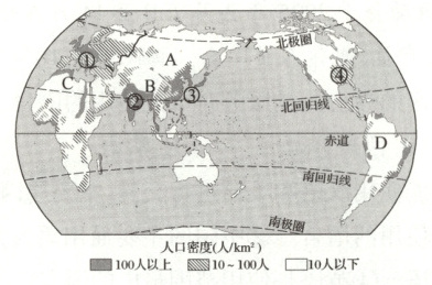 (2) 图中人口稀疏区的气候类型名称:A处于