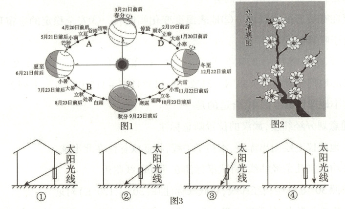 。(4分)(4)当《九九消寒图》已着色染梅花30瓣时,最接近的节气是大寒,此时,地球正处于图1所示公转轨道中的