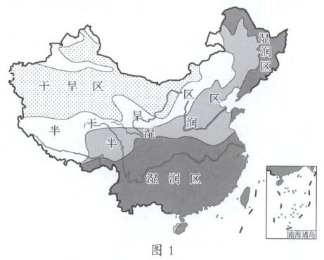 每年 5 月 21 日前后为我国小满节气。南方地区民谚“小满小满,江河渐满”,含义是“雨水开始增多,江河水位上涨”。图 1 为中国干湿地区分布图,图 2 为 2020—2024 年我国月平均降水量柱状图,据此完成 1~2 题。