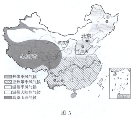本草,是中药的统称,明代李时珍编撰的《本草纲目》记载了我国 1892 种中草药,我国本草种类丰富。图 3 为我国部分本草分布图。读图,完成 4~5 题。