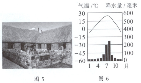 (情境化)山东烟墩角村 2024 年入选世界“最佳旅游乡村”。“住海草民宿、赏天鹅海湾”是烟墩角村的金字招牌。海草房的墙壁很厚,多用石块或砖块混合垒成;屋脊高高隆起,房顶苫盖着厚厚的海草(生长在 5~10 米浅海的藻类)。图 5 为海草房景观图,图 6 为当地气温曲线和降水量柱状图。据此完成 3~5 题。