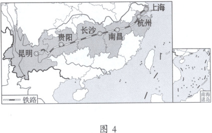 (情境化)2024 年是沪昆高铁江西段开通运营十周年,上海某中学八年级学生暑假乘沪昆高铁去云南研学旅行。图 4 为沪昆高铁线路示意图。读图,完成 1~2 题。