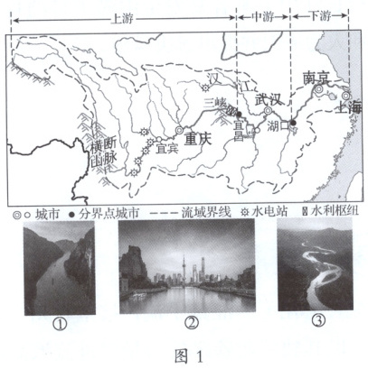 长江是我国第一大河,其上、中、下游的部分河段分别有“山高水急”“九曲回肠”“江阔水深”的特点。读“长江流域示意图及景观图”(图1),完成2~4题。