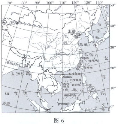 (综合应用)2024年8月29日是我国第21个测绘法宣传日,了解国家版图,认知国家版图,树立国家版图意识是每一位中国公民应尽的义务和责任。某中学地理兴趣小组举行了以“一点一线皆山河”为主题的探究活动,探究中国的疆域及海洋权益的维护。读中国疆域图(图6),完成下列问题。