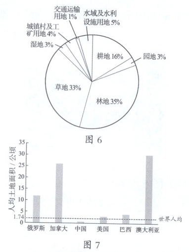 (综合应用)培育农业新质生产力,我们要树立“大食物观”,增强食物多元化供给,将食物来源由耕地向更广阔的国土资源拓展。图6为中国土地资源利用类型构成图,图7为世界面积前六位的国家的人均土地面积与世界人均比较图,图8为中国肉类和水产品人均消费量变化图。读图,完成下列问题。