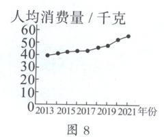 。我国粮食人均消费量持续下降,肉类和水产品人均消费量的变化趋势是上升