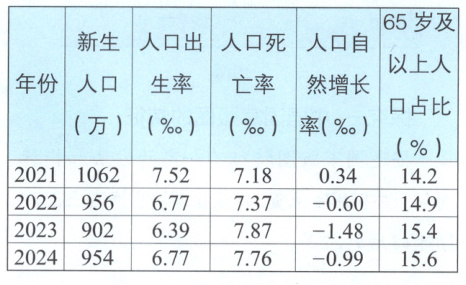 1. 据表判断,关于2021—2024年人口变化的叙述正确的是(