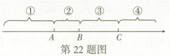 22. 如图,在一条不完整的数轴上,从左到右的点 $A,B,C$ 把数轴分成①②③④四部分,点 $A,B,C$ 对应的数分别是 $a,b,c$,且 $ab < 0$.