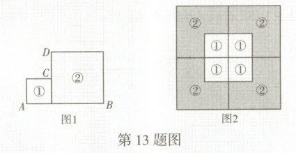 13. 新考法两个大小不一的正方形①和②如图1放置时,$AB = a$,$CD = b$.现有①和②两种正方形各四个,摆放成如图2所示的形状,则阴影部分的面积可用$a$,$b$表示为
