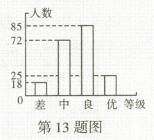 13. 某校举办了“交通安全知识”测试,张老师从全校2000名学生的答卷中随机地抽取了一部分,将测试成绩按“差”“中”“良”“优”划分为四个等级,并绘制成如图所示的条形统计图,则估计全校成绩为“良”或“优”的总人数为