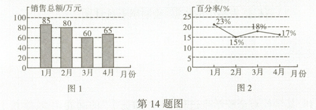 14. 网上一家电子产品店今年1月至4月的电子产品销售总额如图1所示,其中一款平板电脑的销售额占当月电子产品销售总额的百分比如图2所示. 根据图中信息,回答下列问题: