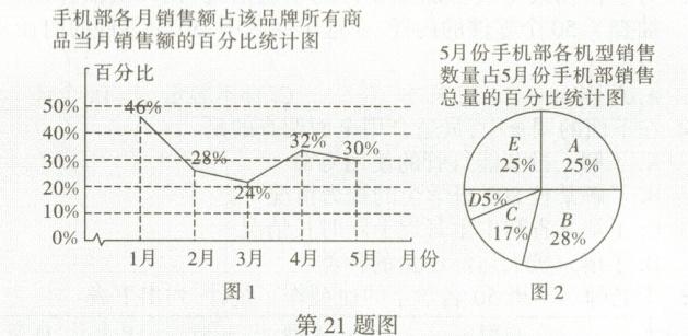 21. 某电子品牌商下设台式电脑部、平板电脑部、手机部等. 2023年的前五个月该品牌全部商品销售额共计600万元. 下表表示该品牌商2023年前五个月的月销售额(统计信息不全,单位:万元);图1表示该品牌手机部各月销售额占该品牌所有商品当月销售额的百分比统计图;图2表示5月份手机部各机型销售数量占5月份手机部销售总量的百分比统计图.