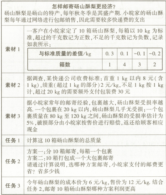 方案二:因为这10箱砀山酥梨的总质量为100kg,