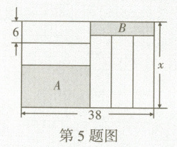 5. 如图,长为38 cm,宽为$x$ cm的大长方形被分割成7小块。除阴影$A$,$B$外,其余5块是形状、大小完全相同的小长方形,其较短的边长为6 cm,则阴影$A$的周长比阴影$B$的周长多 (