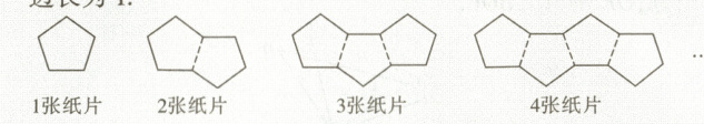 18. 如图,用一些完全相同的正五边形纸片依次“粘连”成一条纸带,探究纸片张数$n$与纸带周长$l$的关系,设每个正五边形的边长为1.