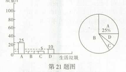 21. 生活垃圾的分类与回收利用可以减少污染,生活垃圾一般可分为四大类:可回收物(A)、厨余垃圾(B)、有害垃圾(C)和其他垃圾(D),某垃圾处理厂统计了居民的生活垃圾的分类情况,以下是根据调查结果分别整理的不完整的条形统计图和扇形统计图.