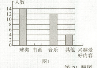 21. 班长小李对他所在班级全体同学的业余兴趣爱好进行了一次调查,据采集到的数据绘制了如下两幅不完整的统计图,根据调查他想写一个调查报告交给学校,建议学校根据学生的个人兴趣爱好,适当地安排一些特长培养或合理安排学生在校期间的课余活动,请你根据图中提供的信息,帮助小李完成信息采集.