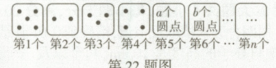 22. 如图,从左向右依次摆放序号分别为1,2,3,…,$n$的小正方形卡片,每个小正方形卡片上均画有若干个小圆点,其中任意相邻的4个小正方形卡片上的小圆点数量之和相等.