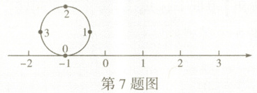 7. 如图,圆的周长为4个单位长度,在该圆的4等分点处分别标上0,1,2,3,先让圆周上表示数字0的点与数轴上表示-1的点重合,再将圆沿着数轴向右滚动,则数轴上表示2 025的点与圆周上重合的点表示的数字是(