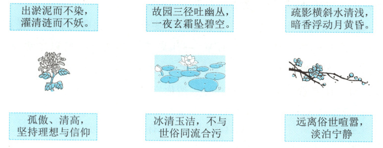 五、【语文要素】活动最后,同学们从丁香花想开去,绘制了一组心语花鉴,记录花朵的美好,品悟其象征意义。请你将下列诗文描写的花与其对应的象征意义连线。