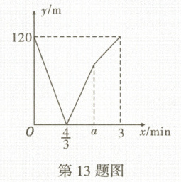 13. 甲从 $ A $ 地前往 $ B $ 地,乙从 $ B $ 地前往 $ A $ 地,同时出发,匀速行驶.甲、乙两人之间的距离 $ y $(单位:m)与甲行走时间 $ x $(单位:min)的函数关系如图所示,则 $ a = $