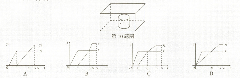 10. 核心素养·空间观念 如图,长方体水池内有一无盖圆柱形铁桶,现用水管往铁桶中持续匀速注水,直到长方体水池有水溢出一会儿为止.设注水时间为 $ t $, $ y_1 $ 表示铁桶中水面高度, $ y_2 $ 表示水池中水面高度(铁桶高度低于水池高度,铁桶底面积小于水池底面积的一半,注水前铁桶和水池内均无水),则 $ y_1,y_2 $ 随时间 $ t $ 变化的函数图象大为(