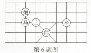 6. 数学文化象棋在中国有着三千多年的历史,如图是一方的棋盘。如果“帅”的坐标是$ (1,1) $,“卒”的坐标是$ (3,2) $,那么“马”的坐标是(