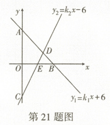 21. 如图,在平面直角坐标系中,一次函数$y_{1}=k_{1}x+6$的图象($k_{1}$是常数且$k_{1}\neq0$)分别与$x$轴和$y$轴交于点$B$和点$A$,一次函数$y_{2}=k_{2}x-6$的图象($k_{2}$是常数且$k_{2}\neq0$)分别与$x$轴和$y$轴交于点$E$和点$C$,直线$AB$与$CE$交于点$D(4,2)$。