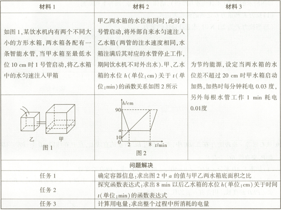 ∴8min以后乙水箱的水位h(单位:cm)关于时间t(单位:min)的函数表达式为