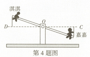 4. 如图,嘉嘉与淇淇玩跷跷板游戏,跷跷板的支点O(即跷跷板的中点)到地面的距离是60 cm,当淇淇从水平位置CD垂直上升15 cm时,嘉嘉离地面的高度是(
