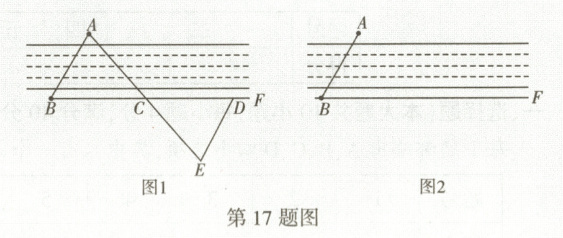 17. 核心素养·应用意识如图1,两个建筑物A,B分别位于河的两岸,要测得它们之间的距离,可以从B出发沿河岸画一条射线BF,在BF上截取$BC = CD$,过点D作$DE// AB$,使点E,C,A在同一条直线上,则DE的长就是A,B之间的距离,请说明理由.还有其他测量A,B之间的距离的方法吗? 请把设计方案画在图2上,并说明理由.