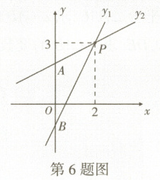 6. 教材$P45$例$6$变式如图,已知一次函数$y_1 = k_1x - 1$与一次函数$y_2 = k_2x + 2$的图象交于点$P(2,3)$,一次函数$y_1$和$y_2$与$y$轴分别交于点$B$和点$A$,下列结论中正确的是(