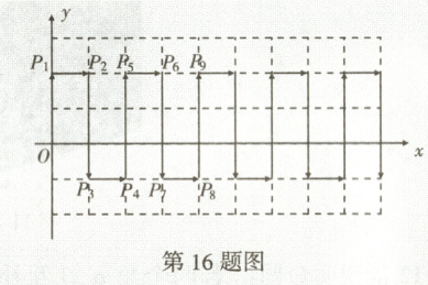16. 如图,某一个机器狗在平面直角坐标系中行走的路线是$O\to P_1\to P_2\to P_3\to P_4\to·s$已知点$P_1(0,2)$,$P_2(1,2)$,$P_3(1,-1)$,$P_4(2,-1)$,$·s$,归纳行走的路线与坐标规律,回答下列问题: